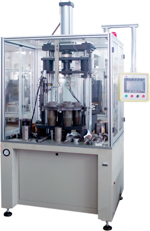 Suitable for pressing the core into the lamination.Adopted Mitsubishi PLC, color touch screen control, five workstaitons translocation work,hydraulic system as a source of power, into the shaft, a pressure sensor to measure pressure into the shaft, with measuring the size of grating, alarm if tolerance or press-fit force is too large or too small, a photoelectric safety switch.